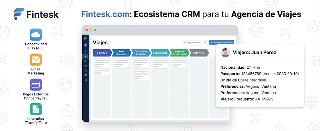 - La Solución de Integración: La agencia debe adoptar un enfoque de "Best-of-Breed". Utilizar Fintesk para el control del pipeline y el seguimiento comercial, pero integrar una herramienta especializada (como(https://travefy.com/) o Axus) para la generación del itinerario. El enlace del itinerario final se almacenaría en un campo personalizado URL dentro del "Trato" en Fintesk, manteniendo el orden administrativo sin sacrificar la calidad visual de la venta.